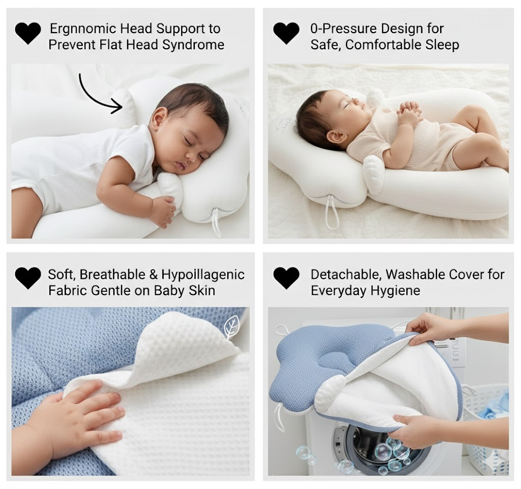 This ergonomic baby pillow’s 0-pressure design, breathable fabric, and perfect head support prevent flat head syndrome while keeping your little one snug, cool, and smiling through every nap and night.