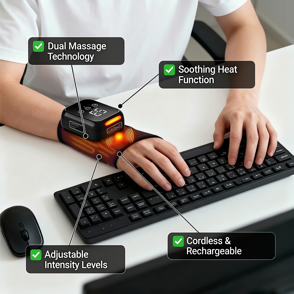 ✅ The dual-therapy system combines warming relief with targeted vibration. The heat relaxes tight muscles and improves circulation, while vibration helps reduce stiffness, ease pain, and enhance wrist mobility.