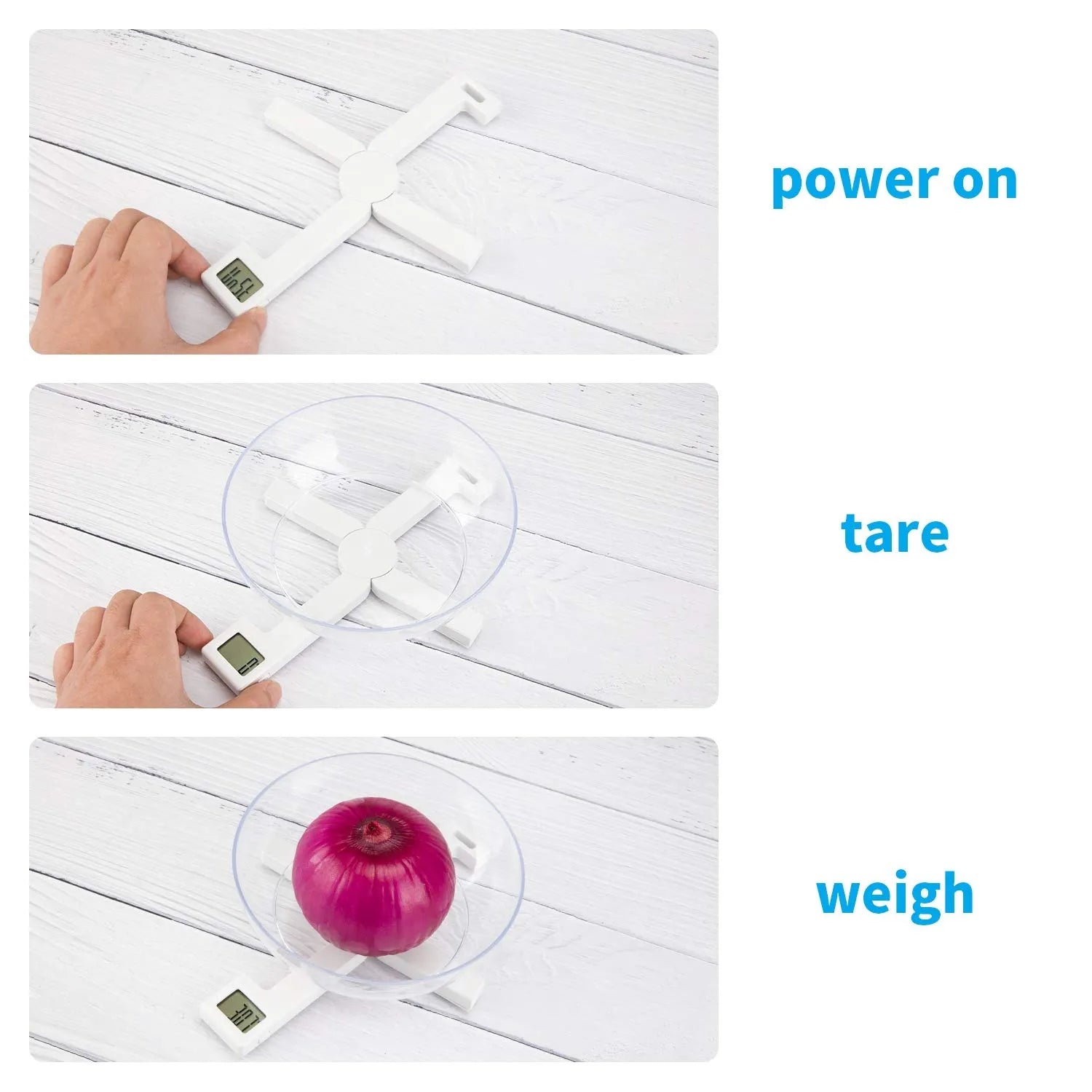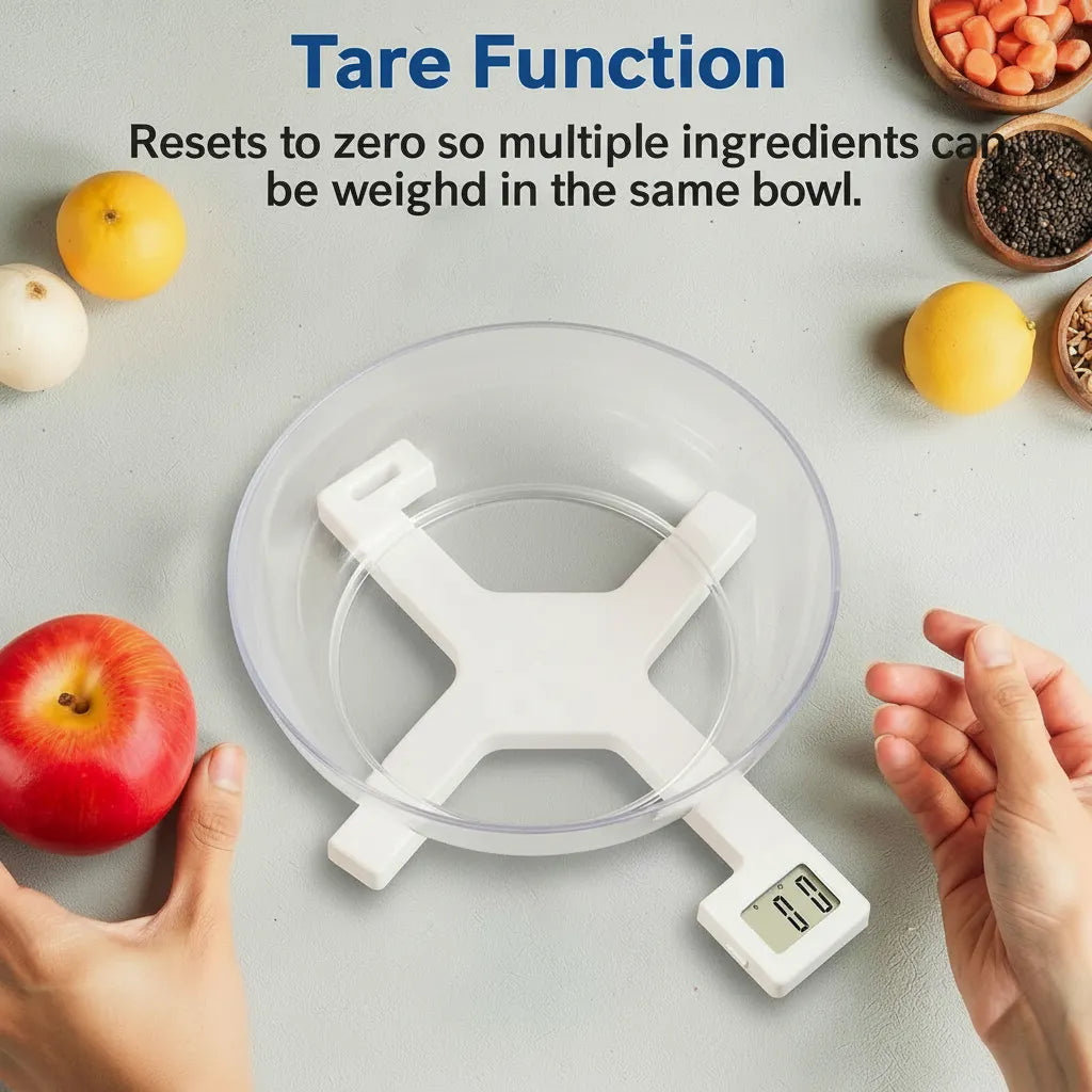 Place an empty container on the scale, press the TARE button to reset to zero, then add the ingredient. Only the ingredient weight is shown.