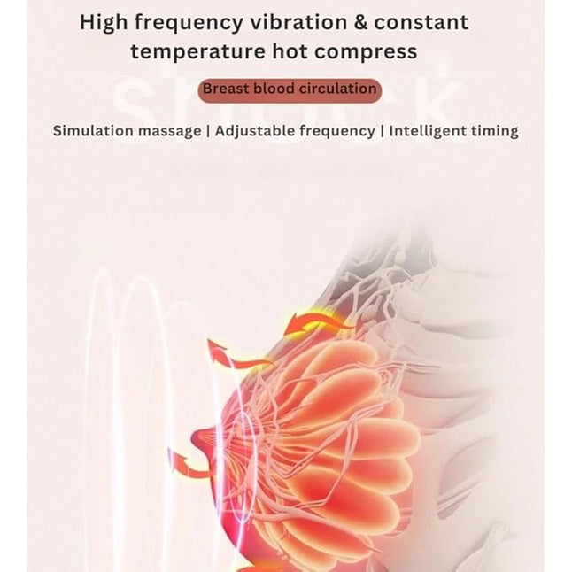 The device combines soothing heat therapy with gentle vibration massage to relieve chest pain, swelling, and stiffness. It improves blood circulation, promotes relaxation, and supports natural firmness. Over time, it helps reduce discomfort and provides daily wellness care.